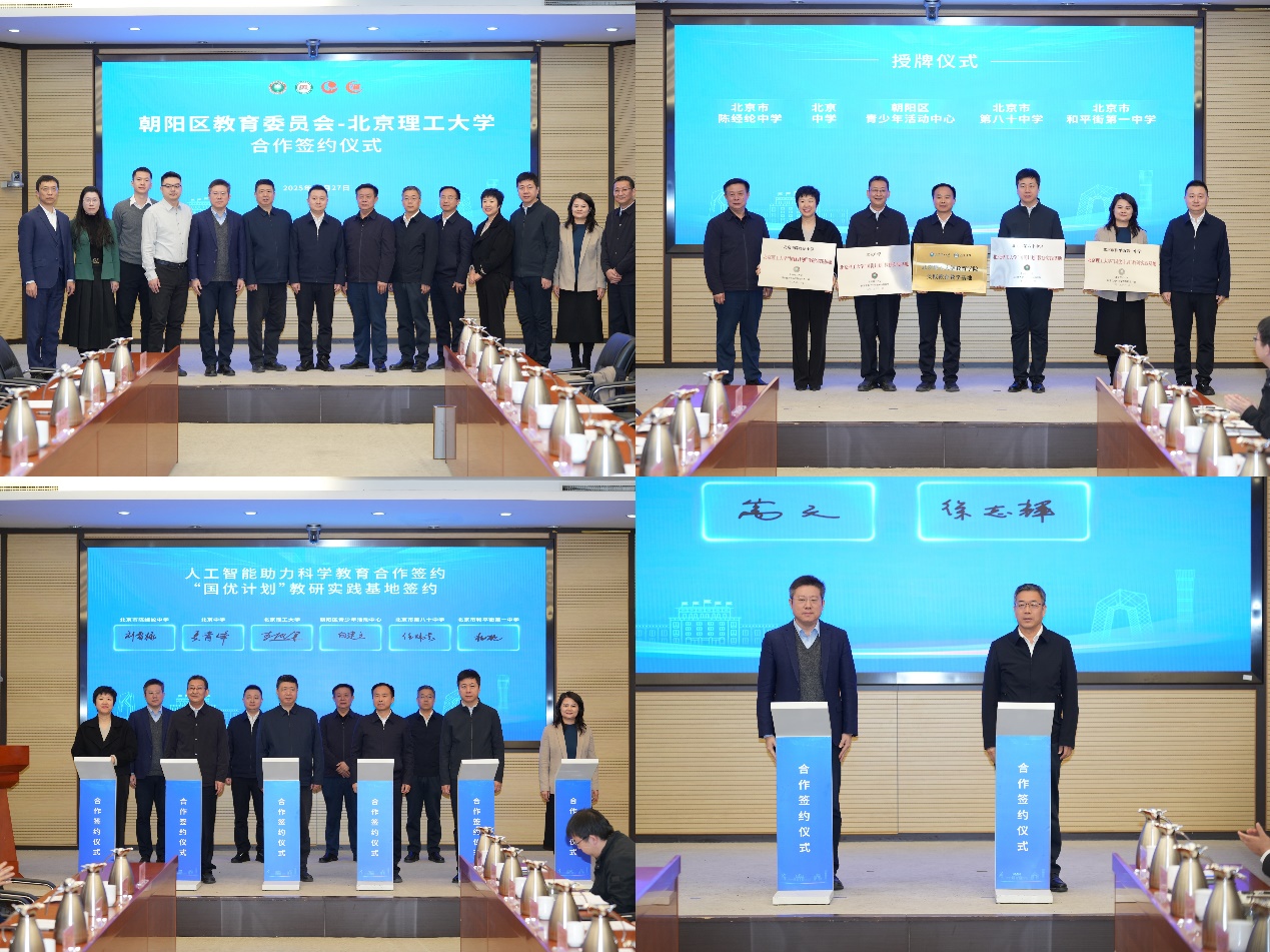 北京理工大学党委副书记杨帆、教育学院党委书记李汉军、教育学院院长兼党委副书记嵩天,以及朝阳区委教育工委书记董健、朝阳区教育委员会主任徐志辉等领导的共同见证下,北京理工大学教育学院与朝阳区教育委员会签署了合作框架协议。教育学院与朝阳区青少年活动中心签订合作协议。北京理工大学与北京中学、北京市第八十中学、北京市陈经纶中学、北京市和平街第一中学签订了“国优计划”教研实践基地协议。北京理工大学党委副书记杨帆为五家合作单位授牌,标志着校地协同、共育卓越师资与创新人才的新篇章正式开启。实现了高校、地方、中学协调联动,构建了全方位、多主体的协同育人路径,为未来教师队伍的数字素养提升注入新的活力。