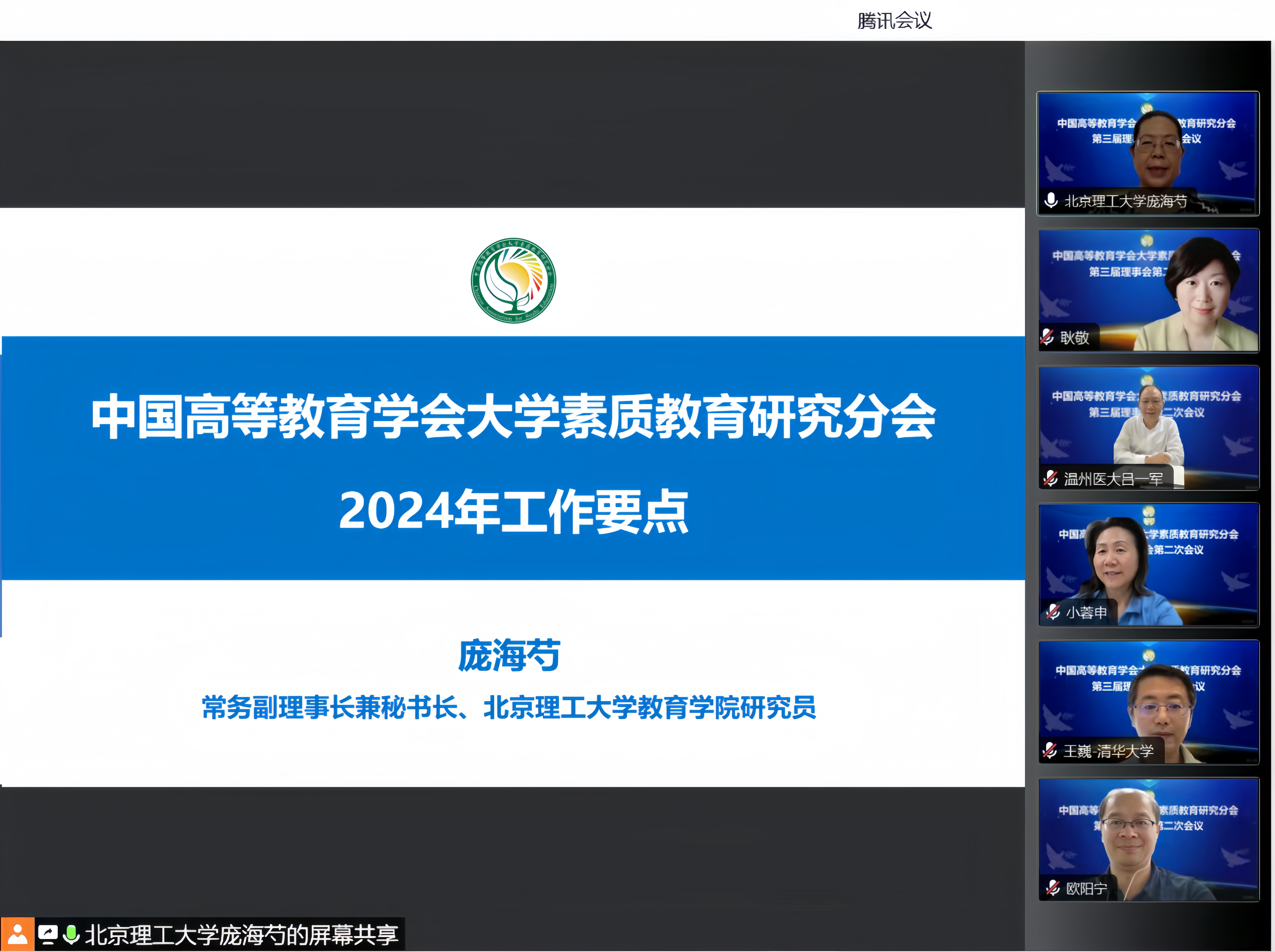 2024年6月11日,中国高等教育学会大学素质教育研究分会第三届理事会第二次会议在线召开。理事长、北京理工大学校长姜澜院士出席会议并讲话。常务副理事长兼秘书长、北京理工大学教育学院研究员庞海芍参加会议并作工作汇报。监事、大连理工大学原副校长朱泓,以及华东师范大学副校长程静、电子科技大学党委副书记申小蓉、郑州大学副校长张倩红、温州医科大学党委书记吕一军、云南中医药大学校长丁中涛、武昌理工学院校长赵作斌、北方工业大学副校长栗苹、大连大学副校长李清、广东工业大学党委副书记朱蔚蔚、哈尔滨工程大学校长助理耿敬、清华大学教务处副处长王巍等多位副理事长出席会议。分会常务理事、理事代表,顾问、学术委员及列席的个人会员共计123人参加了本次会议。会议由副秘书长、西安交通大学教务处副处长杨建科主持。